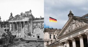 A esquerda o Reichstag destruído pelo Exército Vermelho na batalha de   Berlim. A direita, o prédio nos dias atuais